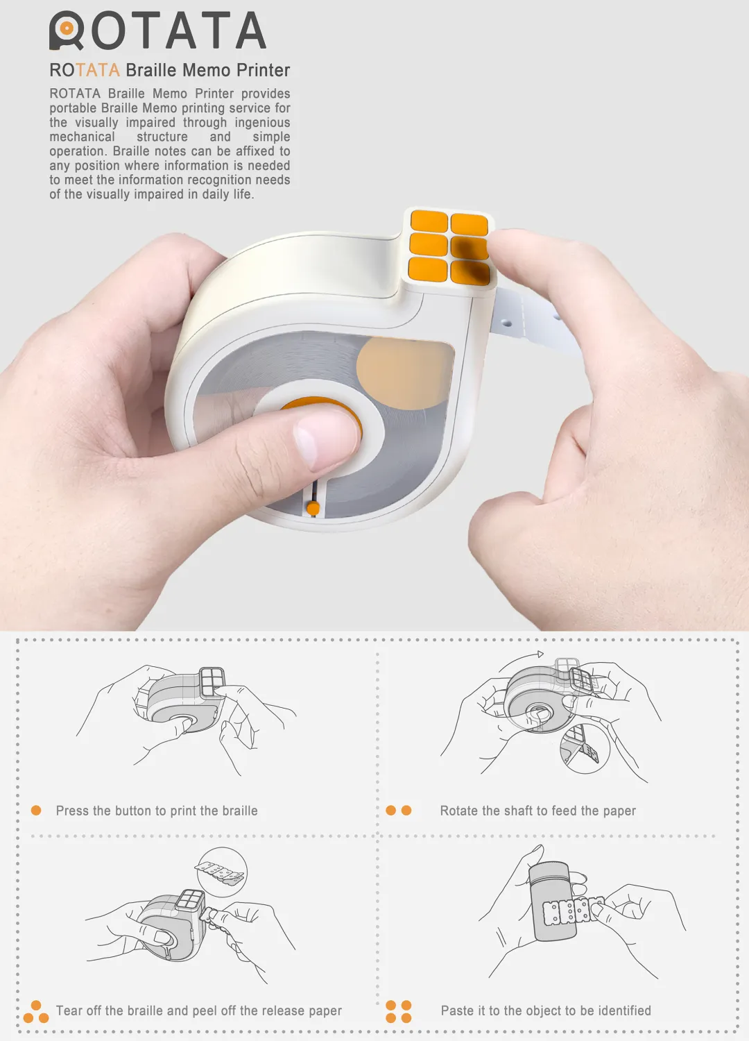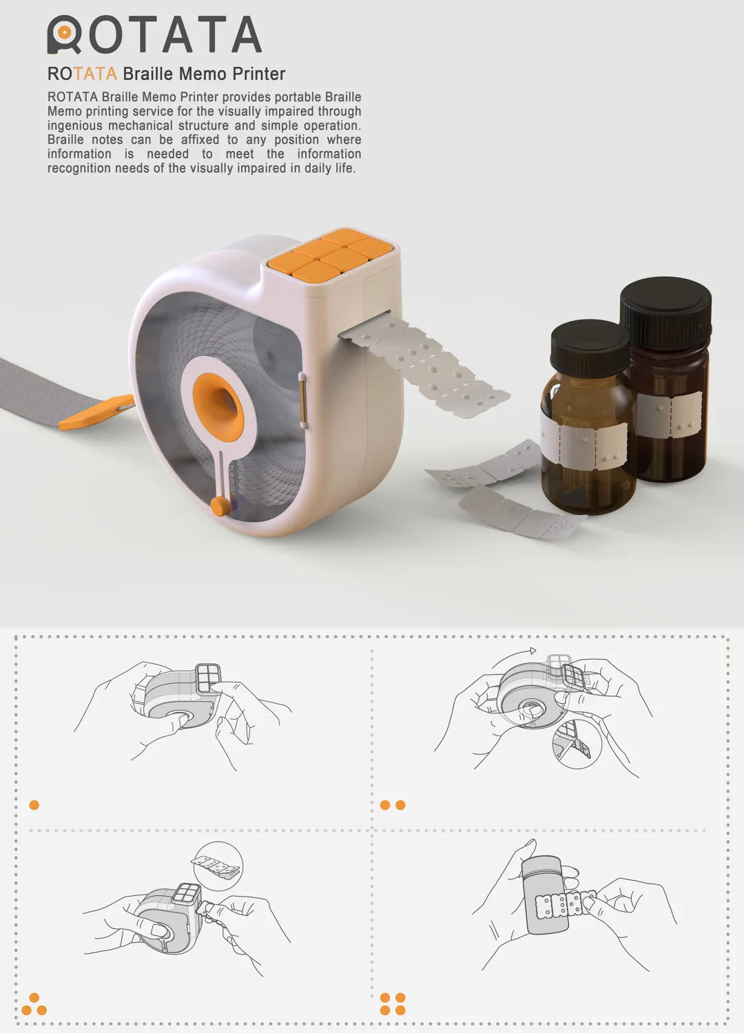 02、ROTATA設(shè)計:王小菊、包麗媛、孫居韜、袁炳坤、劉英針對盲人群體來講,視力的限制讓她們更需要這般一張附有彌補信息的“便簽”。盲文獨特屬性所產(chǎn)生的書寫方式,使得現(xiàn)有的便利貼難以滿足其需要。ROTATA盲文備忘打印機經(jīng)過巧妙的機械結(jié)構(gòu)和簡單的操作,為視障人士供給便攜式盲文備忘打印服務(wù)。盲文筆記能夠貼在任何需要信息的位置,以滿足視障人士在平常生活中的信息識別需要。