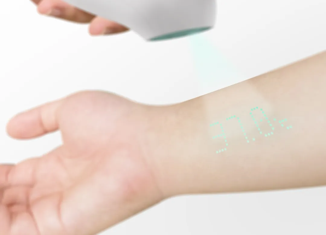 隨著 COVID-19 的爆發(fā),每次溫度測繪似乎都是一次考驗。經(jīng)過持續(xù)模擬測溫場景,咱們捉捕了被測者的潛認識心理,即“測溫時,馬上就想曉得當前溫度”。咱們設(shè)計了一種交互方式,將溫度投射到手臂上,以緩解焦慮。運用凸透鏡影像結(jié)構(gòu)將溫度投射到手臂,一個小的投影會在溫度計和被測者之間產(chǎn)生雙向交互功效。
